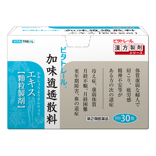 冷え性や更年期障害、月経不順などに用いられる加味逍遙散のエキス顆粒。