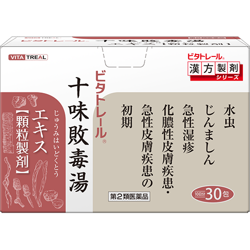 皮膚の急性症状の初期や、じんましん・水虫などに用いられる十味敗毒湯のエキス顆粒。