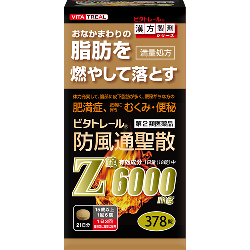 腹部に皮下脂肪が多く便秘がちな方の諸症に用いられる防風通聖散の錠剤(満量処方)。